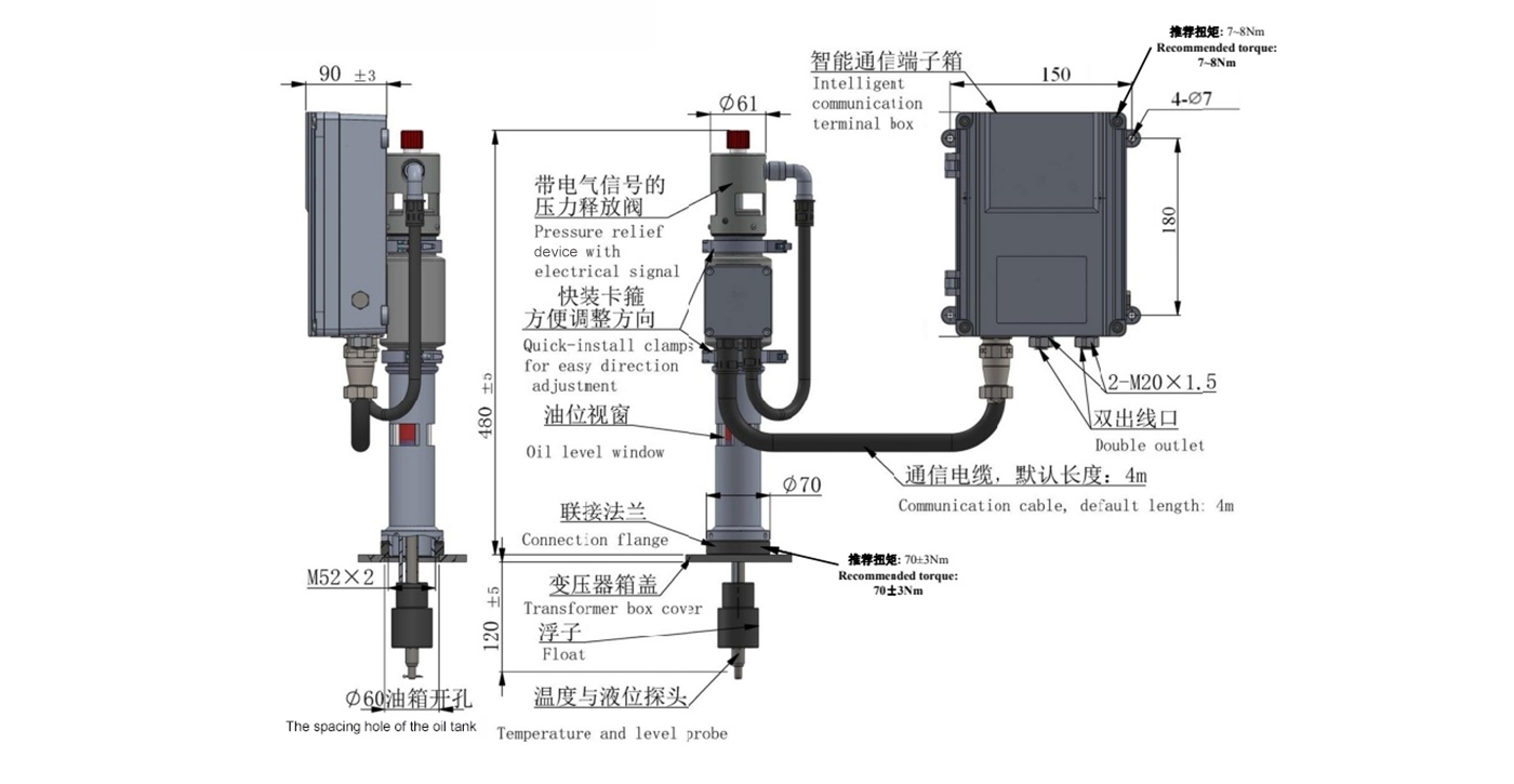 QYW-CQ 系列智能多功能保护器是带 RS485 通信功能全密封变压器的专用保护装置,可对变压器提供:液位连续量监控、压力连续量监控、油面温度连续量监控,还具有注油、补油、压力释放及带电接点输出的压力释放阀(选配)等功能。RS485 通信和 Modbus-RTU 通信可极大方便供电部门实时监视全密封变压器运行情况及诊断变压器故障,适用于智能化全密封变压器及智能化箱式变电站。