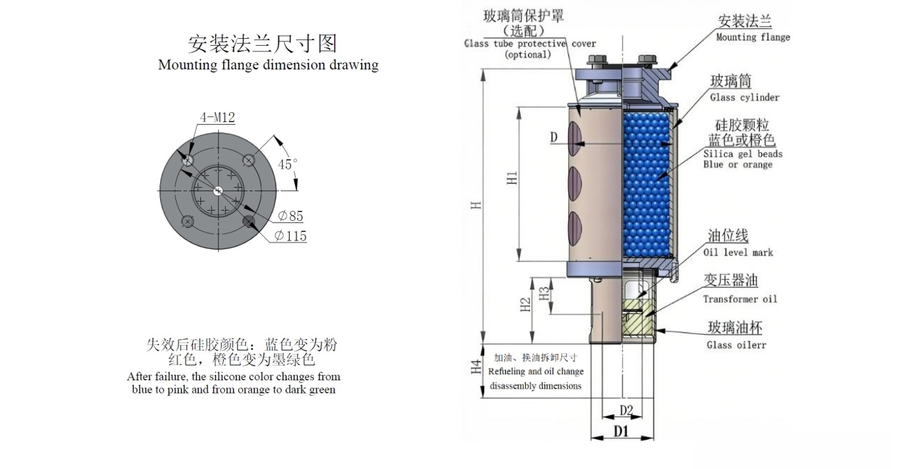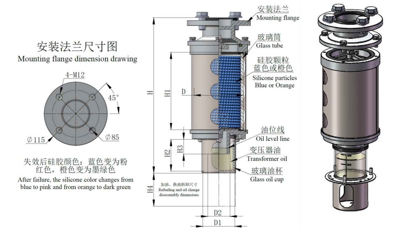 2. 底部采用双层透明钢化玻璃结构,油杯加油后,在变压器工作运行时,直接可以观察到吸湿器的吸气和呼气。